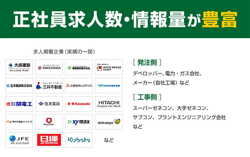 建設、設備に関するほぼ全てのジャンルを網羅した豊富な求人を保有しています。