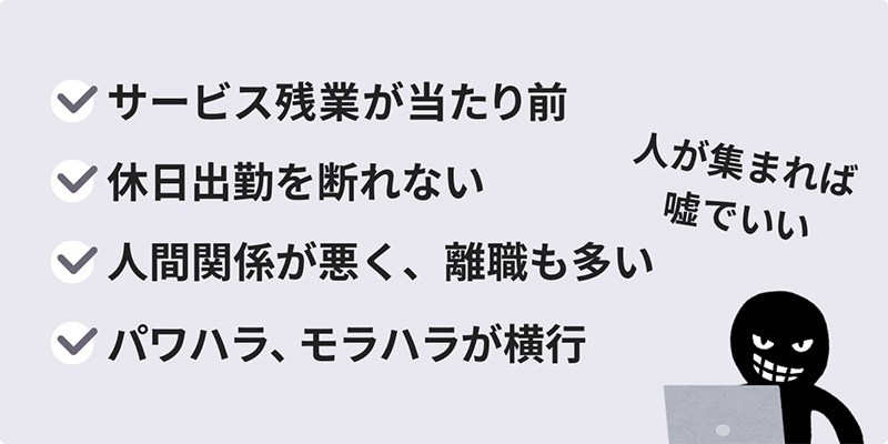 人間関係についてもアットホームと言いながら、パワハラが横行していたり…とにかく都合が悪いことは隠されていることがほとんどです。